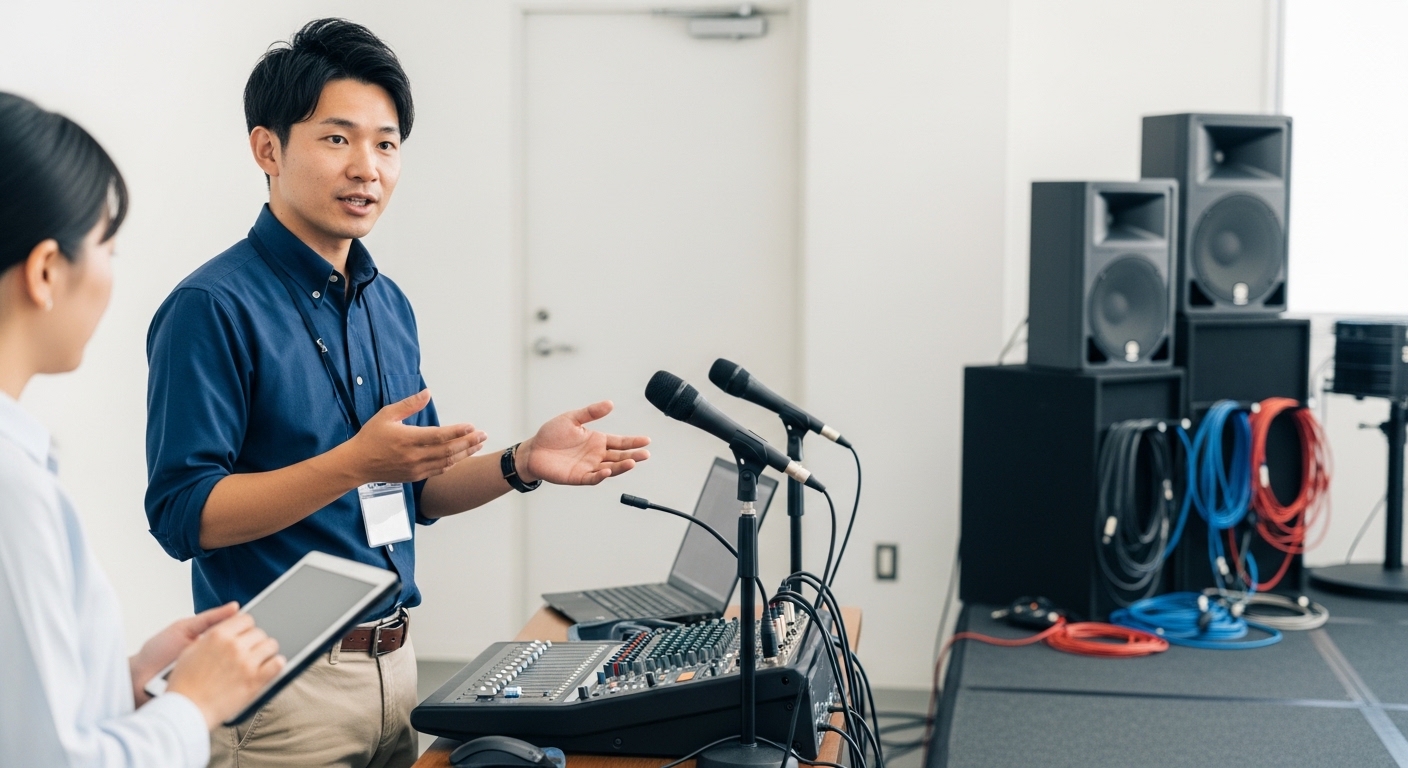 はい、小規模でもステージ・音響・スクリーンを使用する場合は、プロに任せることで機材トラブルや設営時間のリスクを大きく減らせます。特に初めて担当する社員にとっては、基本的なレイアウトや機材構成をプロから学べるため、次回以降の社内ノウハウ蓄積にもつながります。