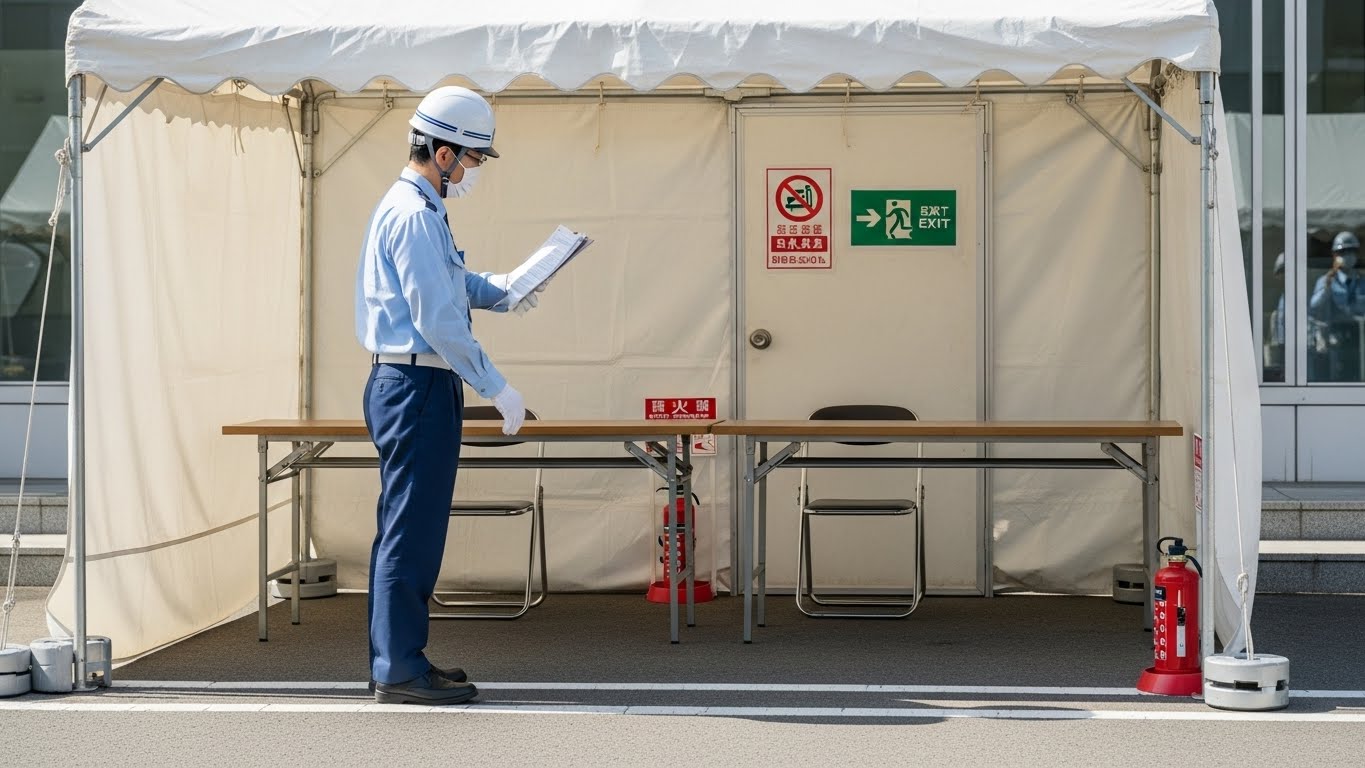 - 防炎認定ラベル付きテントの使用が必須であり、消防法に準拠した防炎性能試験合格品を選ぶべき