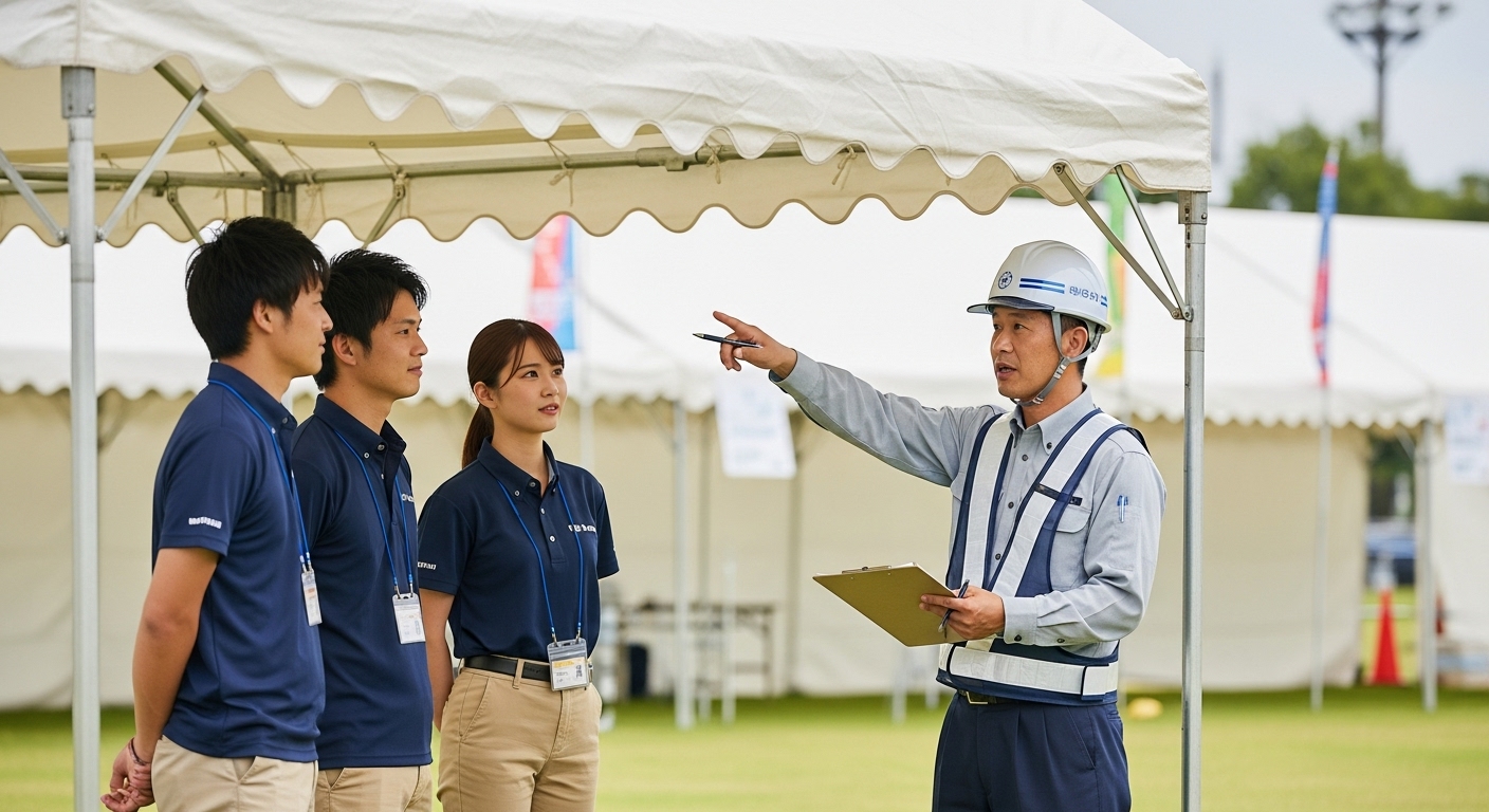 - 名古屋のイベント設営では、防炎テント・避難通路・消火器配置が標準必須条件です。