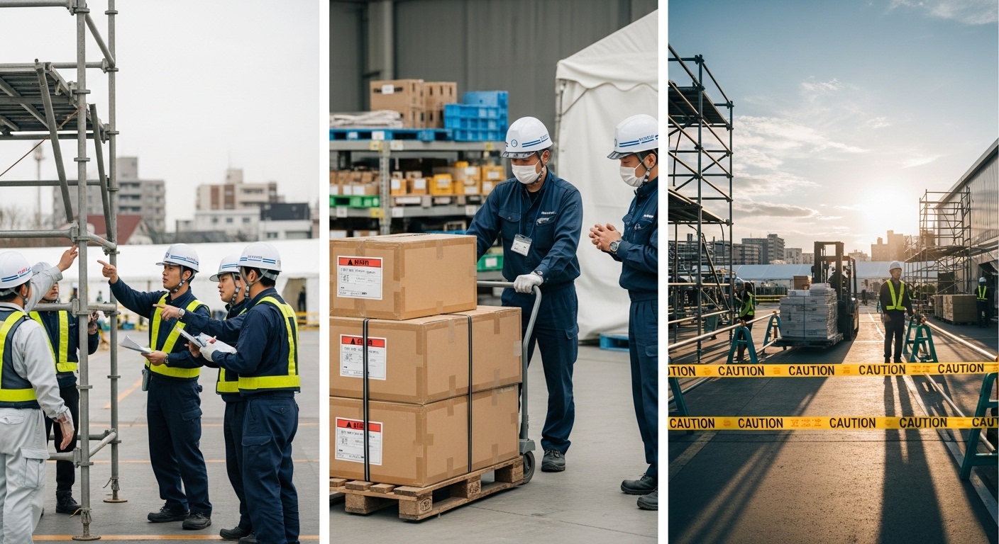 A2. 屋外ではテント・床養生・電源・防雨対策が増えます。天候や地面状態への対策が必要になり、屋内よりも機材と安全備品の種類が増えるからです。